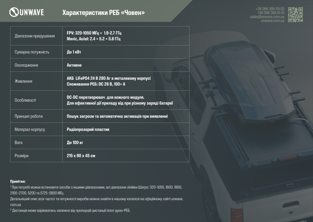 «Човен» орієнтований на найпоширеніші типи ворожих БпЛА та канали управління і має 14 модулів приглушення сигналу: